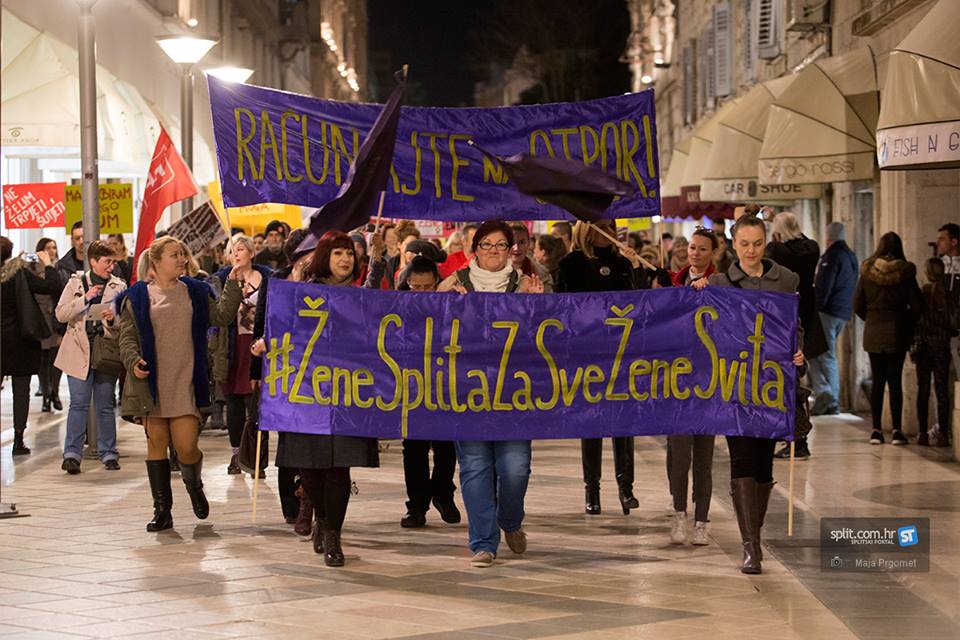 Splitske aktivistice i aktivisti u suradnji s udrugom Domine i organizirale su Noćni marš za prava žena pod geslom: „Računajte na otpor!“ – „Sto godina ženskog pokreta u Splitu!“ i poručile: “Žene Splita prvi puta su se organizirale u Narodnu žensku zadrugu 1918. godine. Nije to bio prvi put da se žene organiziraju i osvajaju javni prostor, ali je značajan događaj u kontinuitetu ženske borbe za jednaka prava i uvažavanje uloge i doprinosa žena u društvu i u našem gradu. Zato ćemo ovogodišnji marš posvetiti tim ženama, ali i ženama današnjeg Splita, Hrvatske i Svijeta, koje 8. ožujka izlaze na ulicu i podsjećaju da su svoju slobodu izborile u dugotrajnoj borbi koja još traje. Neplaćeni i potplaćeni rad, nasilje koje postaje sve brutalnije, direktni napadi na ženu kao slobodno biće koje ima jednaka prava kao i muškarci da slobodno odlučuje o svojim izborima i svom životu, podzastupljenost u tijelima političkog i ekonomskog odlučivanja, oglušivanje i nesposobnost vlasti da prepozna, poštuje i osigura zaštitu prava žena, razlozi su da budemo na ulici na Dan žena.“