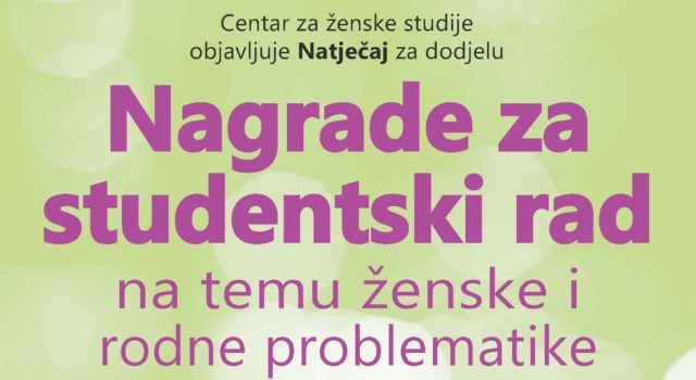 Centar za ženske studije 11. godinu zaredom objavljuje Natječaj za dodjelu Nagrade za studentski rad na temu ženske i rodne problematike. Natječaj je otvoren od 1. lipnja do 1. listopada 2018. godine i namijenjen je svim studenticama i studentima preddiplomskih, diplomskih i integriranih studija visokih učilišta u Republici Hrvatskoj, svih znanstvenih i umjetničkih područja. Prijavljen … Nastavi čitati Nagrada za studentski rad na temu ženske i rodne problematike