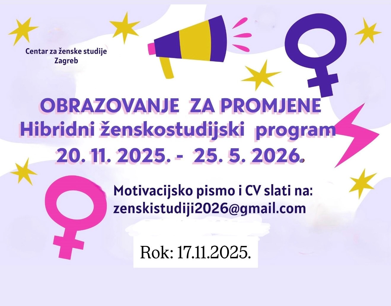 Prijava treba sadržavati: motivacijsko pismo i životopis, koje do 17.11.2025. valja poslati na: zenskistudiji2026@gmail.com